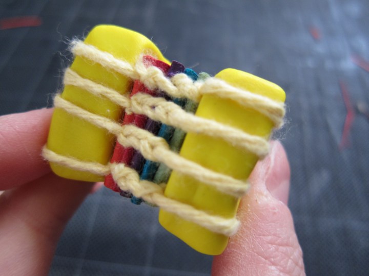 (Exposed chain bind book, 1.5 x 1.5 inches with yellow Sculpey cover and paper pages. 2012)
