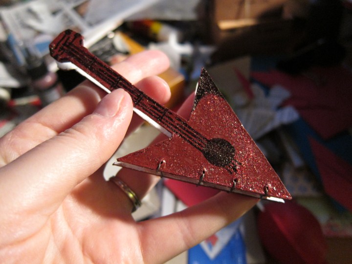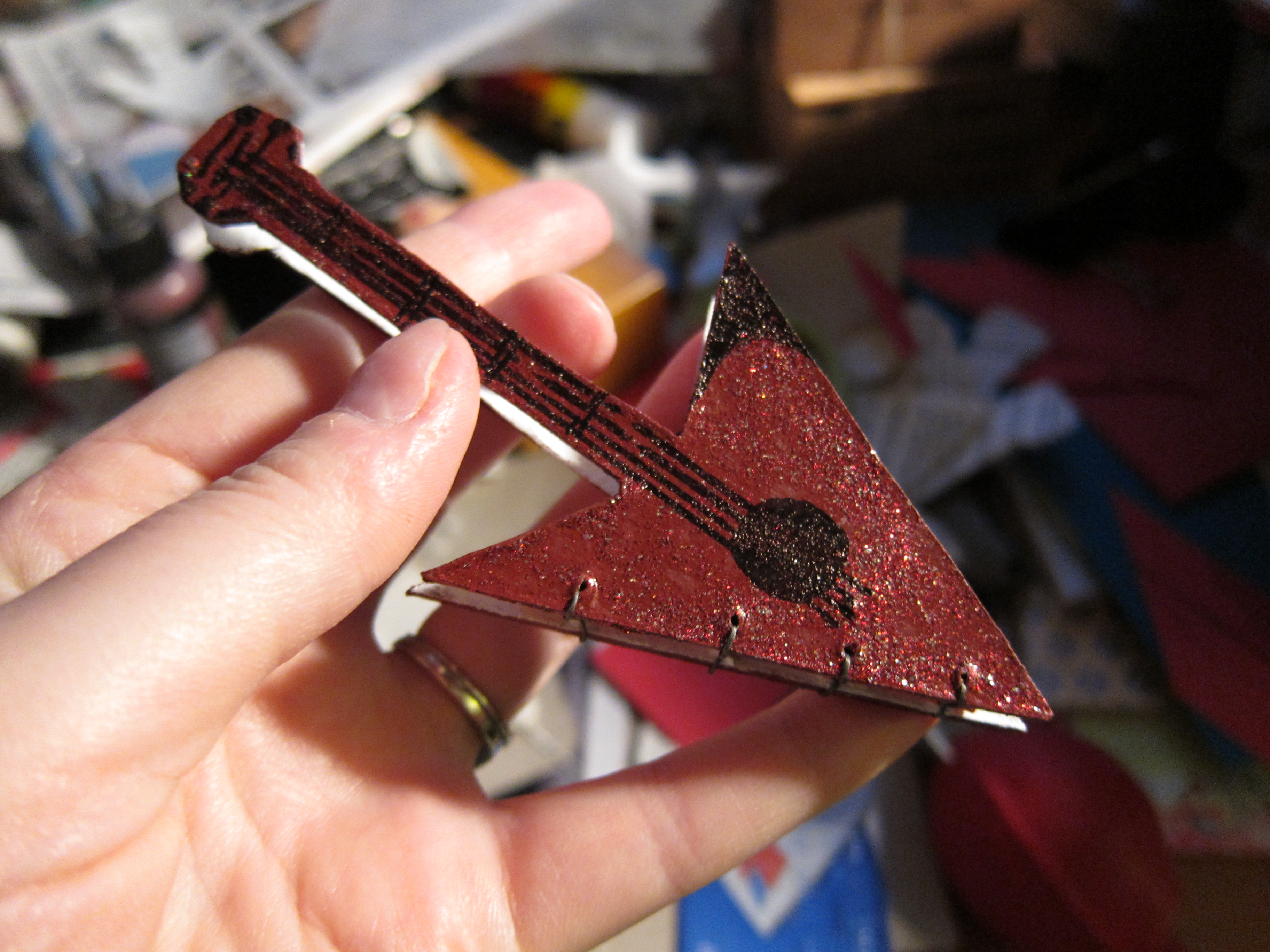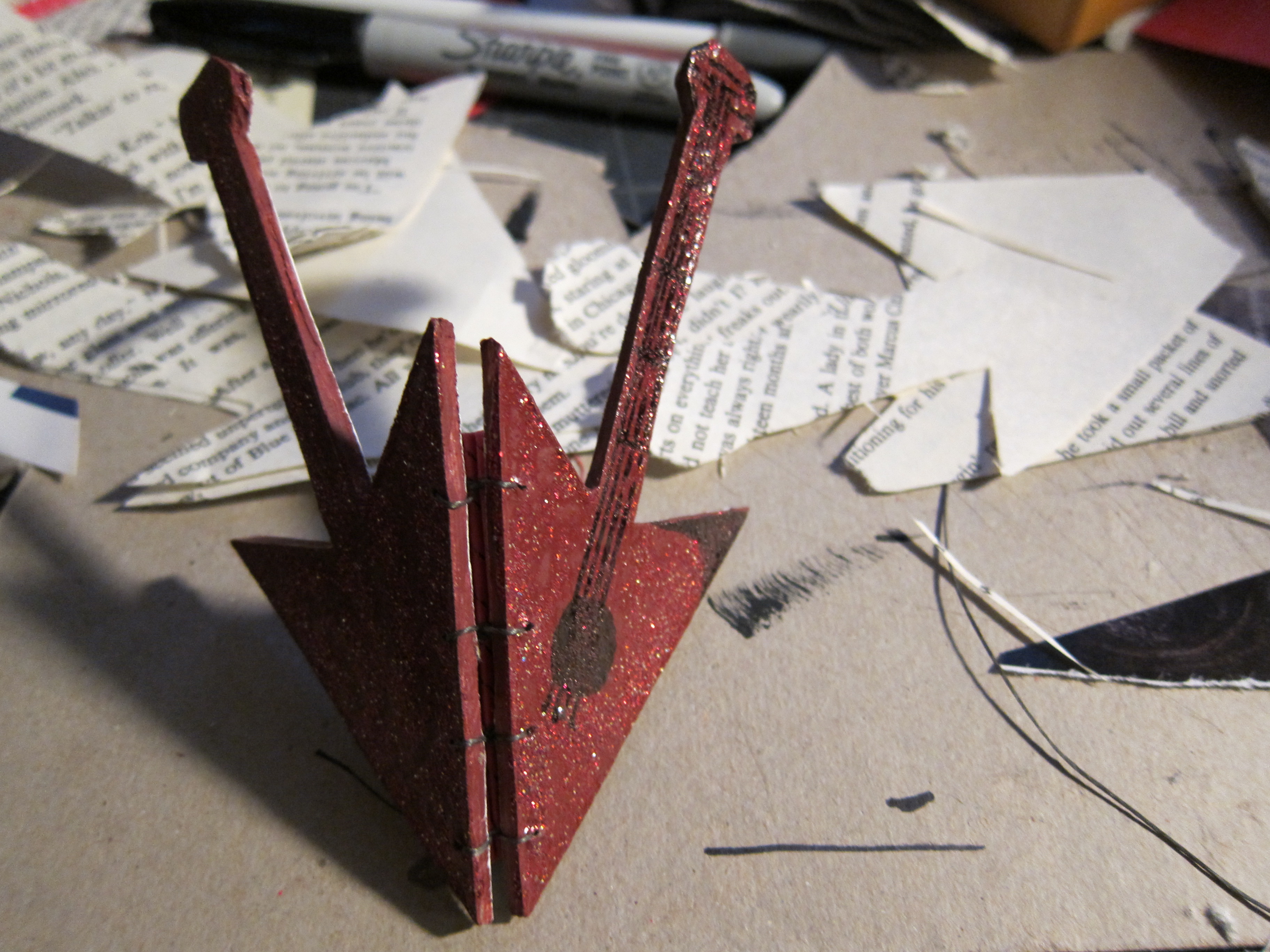 This little guy — a sparkling exposed stitch electric guitar book — is part of a bigger (SECRET) project. But it also stands on its own, I think…so here you go.