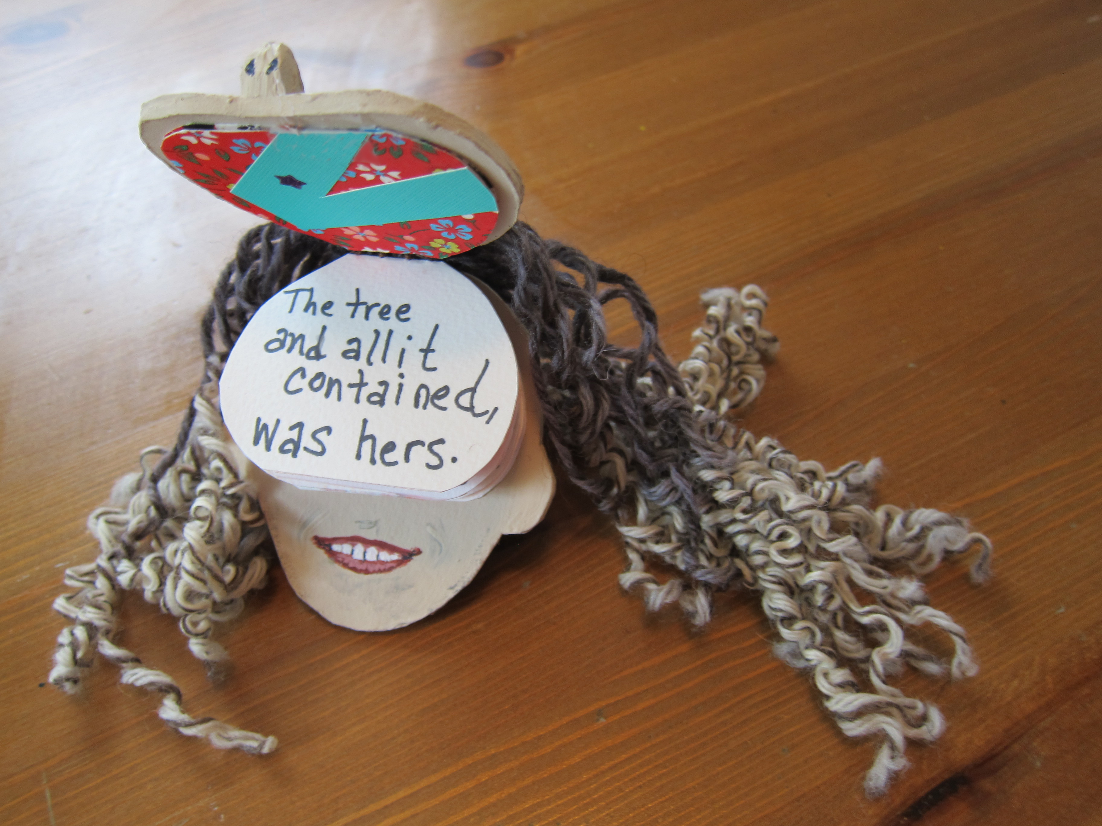 What a challenge to use a book form for portraiture…but also, how apt! A poem aims to shed a certain light on a subject; and its container, its book, can represent the subject in shape, as well. I was paired with a wonderfully imaginative and talented painter named Paola. After meeting up for coffee and a walk, I had enough clues to begin my 3-D portrait, a three-board exposed binding…complete with a portrait-ish poem (“Origin Story: Paola,” inspired by a painting she’s currently working on), nose, hair and a face.