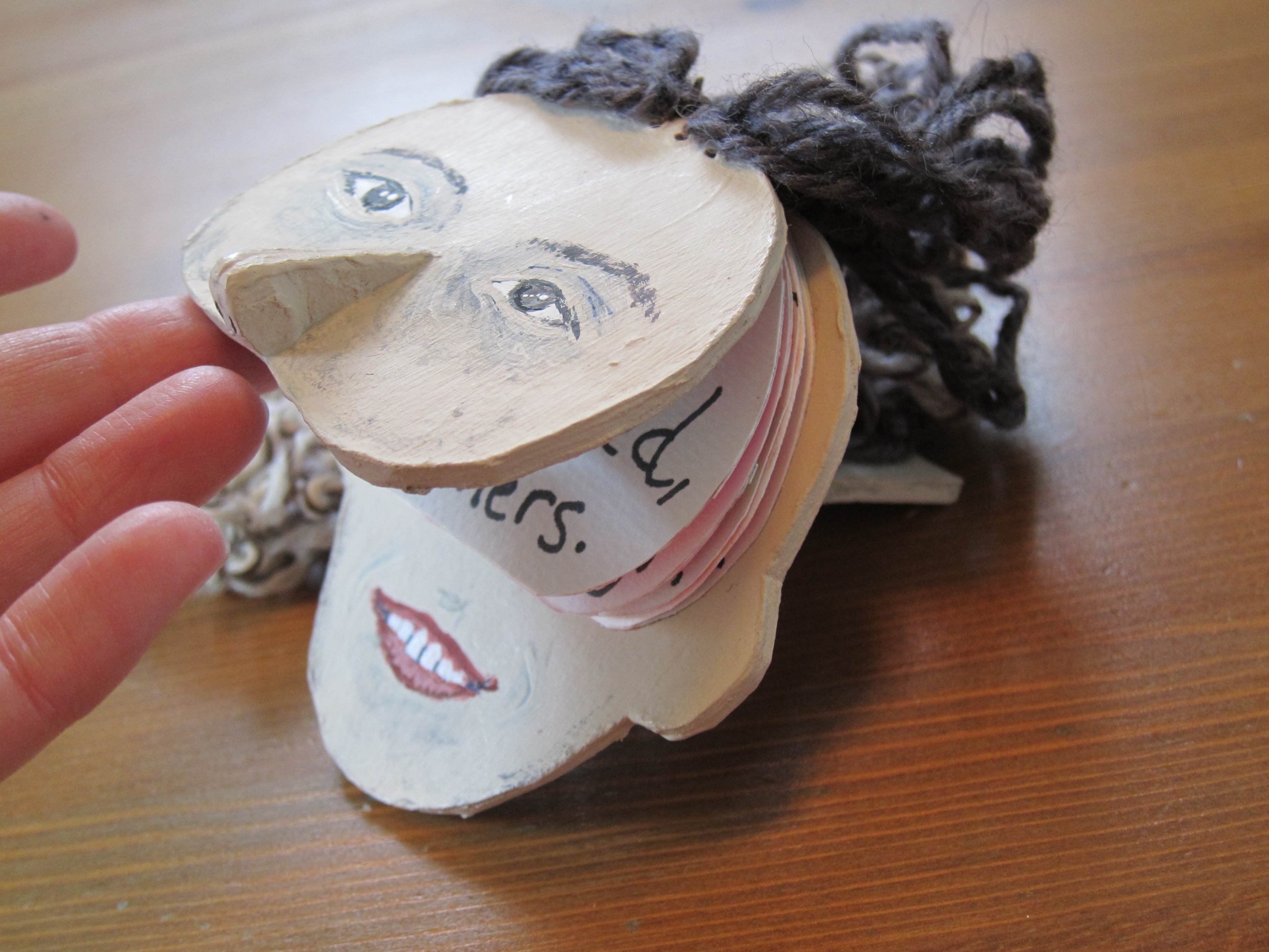 In the end, I did away with the earrings and accepted the fact that she looks more like herself from certain angles than others. And I quite like how her form works, as if we can peer inside her mind a bit by reading her poem.