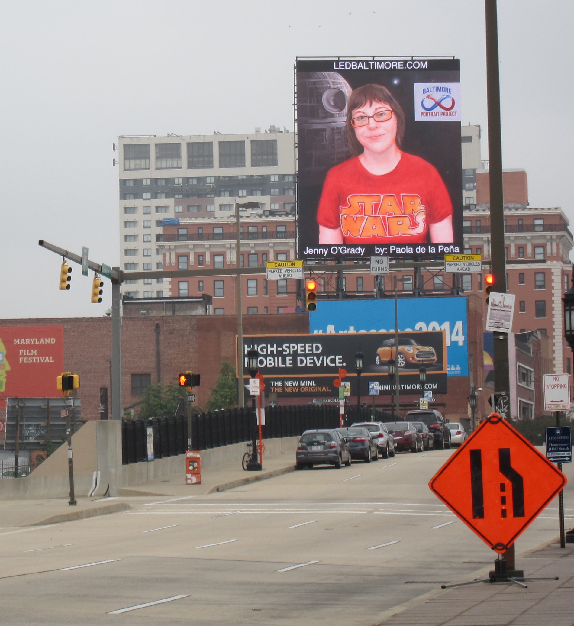 And here’s the result of the Baltimore Portrait Project! Our portraits — my book-y one of Paola (top), and her Star Wars-y one of me — are up on the big LED board on Charles Street in Baltimore’s Station North, right across the street from Penn Station and the 50-foot “Male/Female” sculpture by Jonathan Borofsky. Maybe they’ll wink at each other?