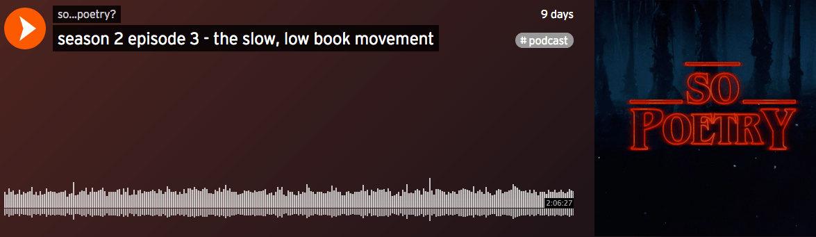 My friend Mychael, who runs the “So….Poetry?” podcast, recently invited me and my fellow book-y friend Meredith to talk book arts. We had a great time — after years of working together, Meredith and I still finish each other’s thoughts — and really dug into questions like what makes a book a book, where do our ideas come from, why it’s cool to take a million years to finish stuff, and the ever-present, WHY??