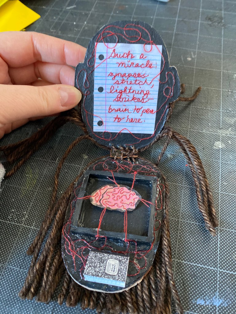 It’s a little stranger to turn the tables on oneself as an artist — at least, it is for me. My self portrait in book form pulls a number of elements together. A brain in hope of connecting two thoughts (that would be nice!). A tiny composition book hoping to capture what falls.