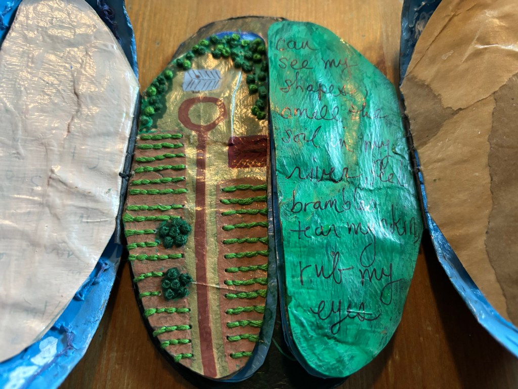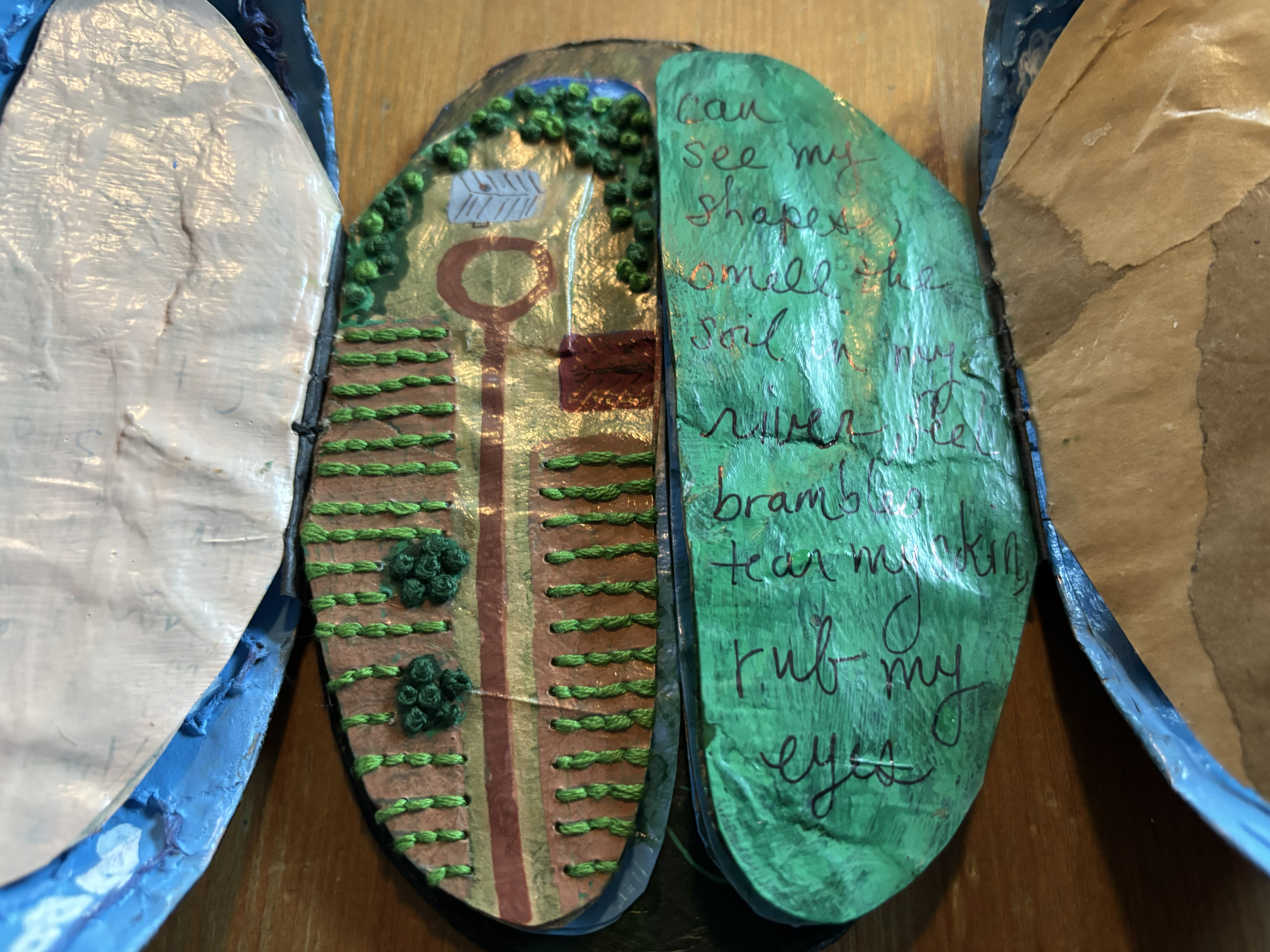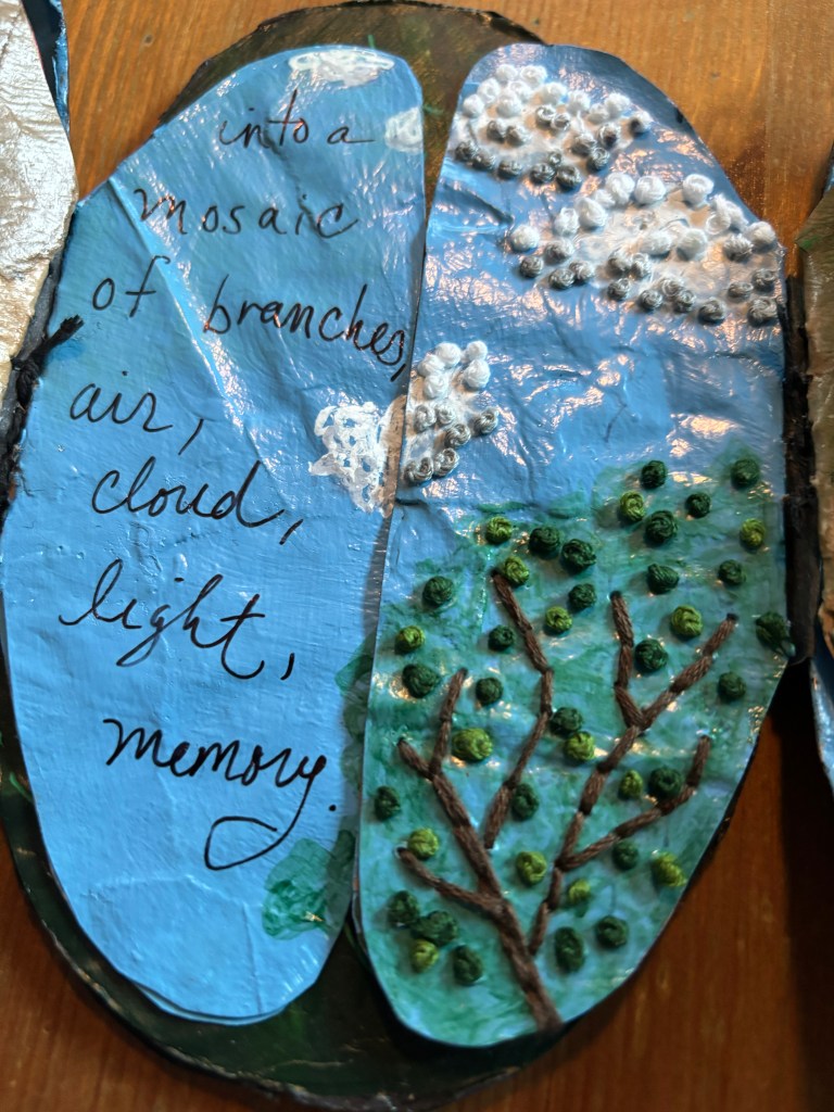 Once I got over the worry of whether the thing would open properly, I very much enjoyed the quiet of sewing on the tough recycled paper outer layer and pages. I had used French knots and running lines to create trees and fields for another project, so it was fun to be able to incorporate them into a tiny map of the farm. And incorporating paints, markers, and embroidery floss gave me some new kinds of layers to play with. Enjoy!