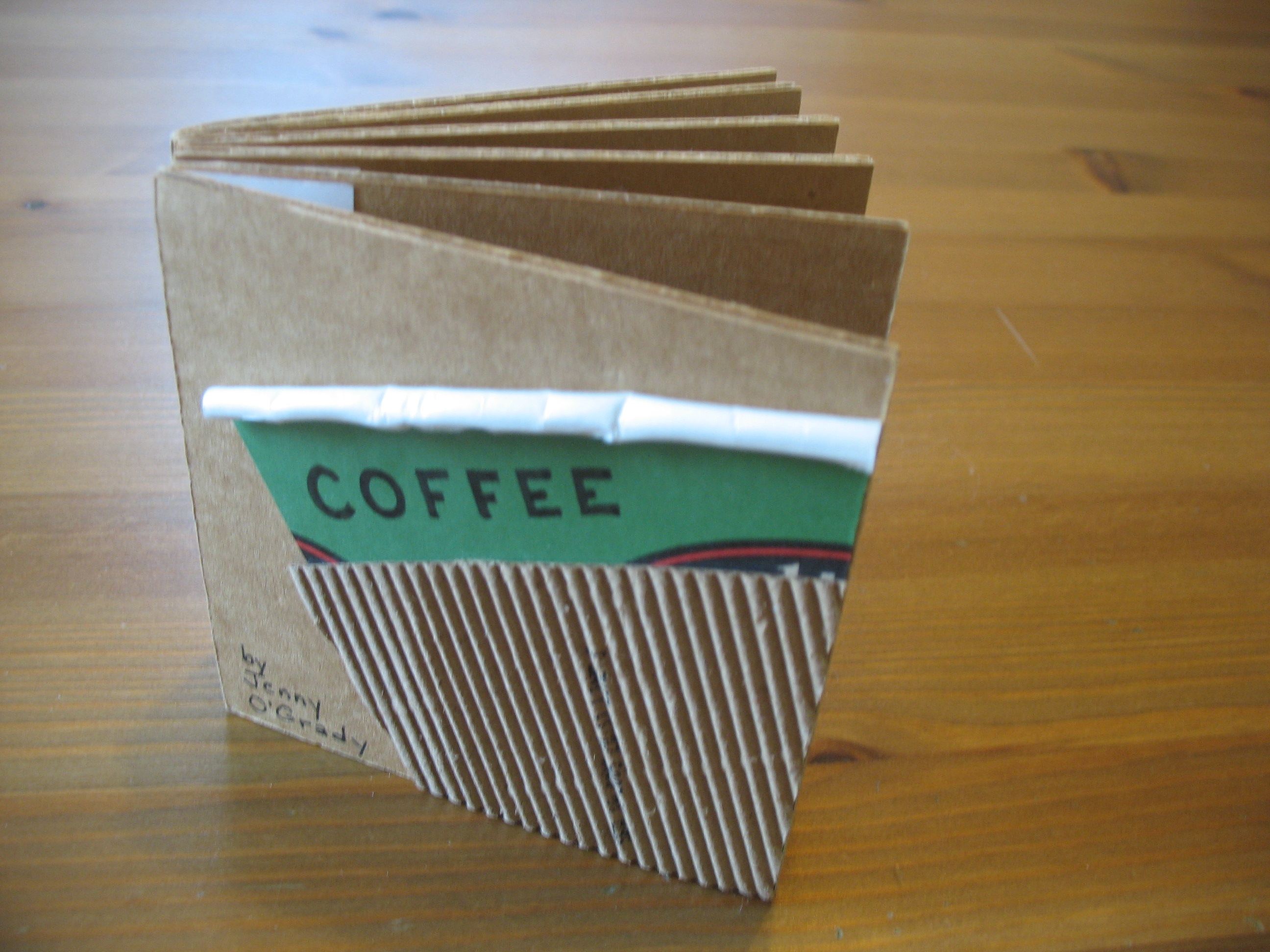 Coffee is made with corrugated cardboard, card stock, an old coffee cup from Seattle’s Best, and pen. It holds a short prose poem by the same name.