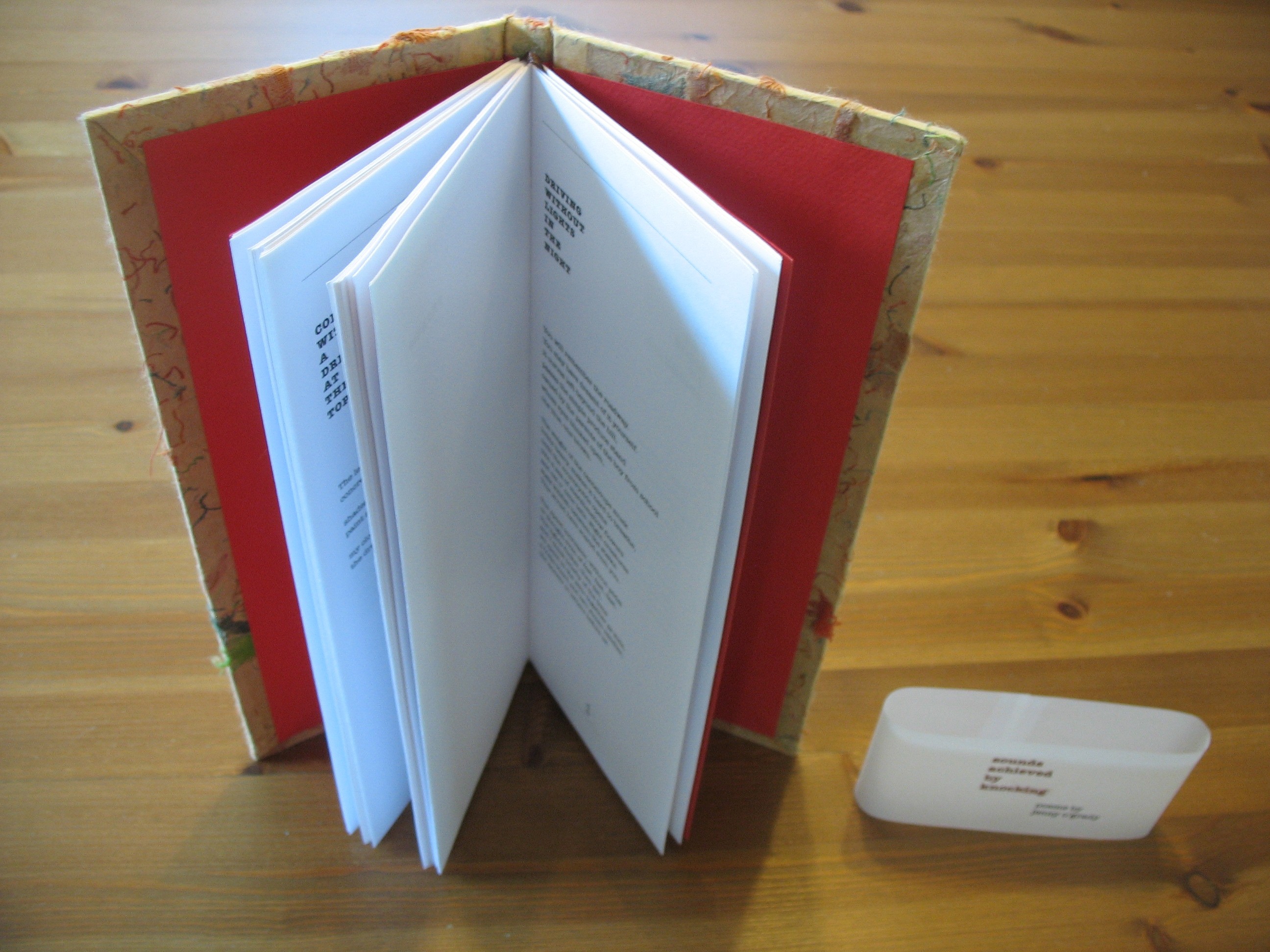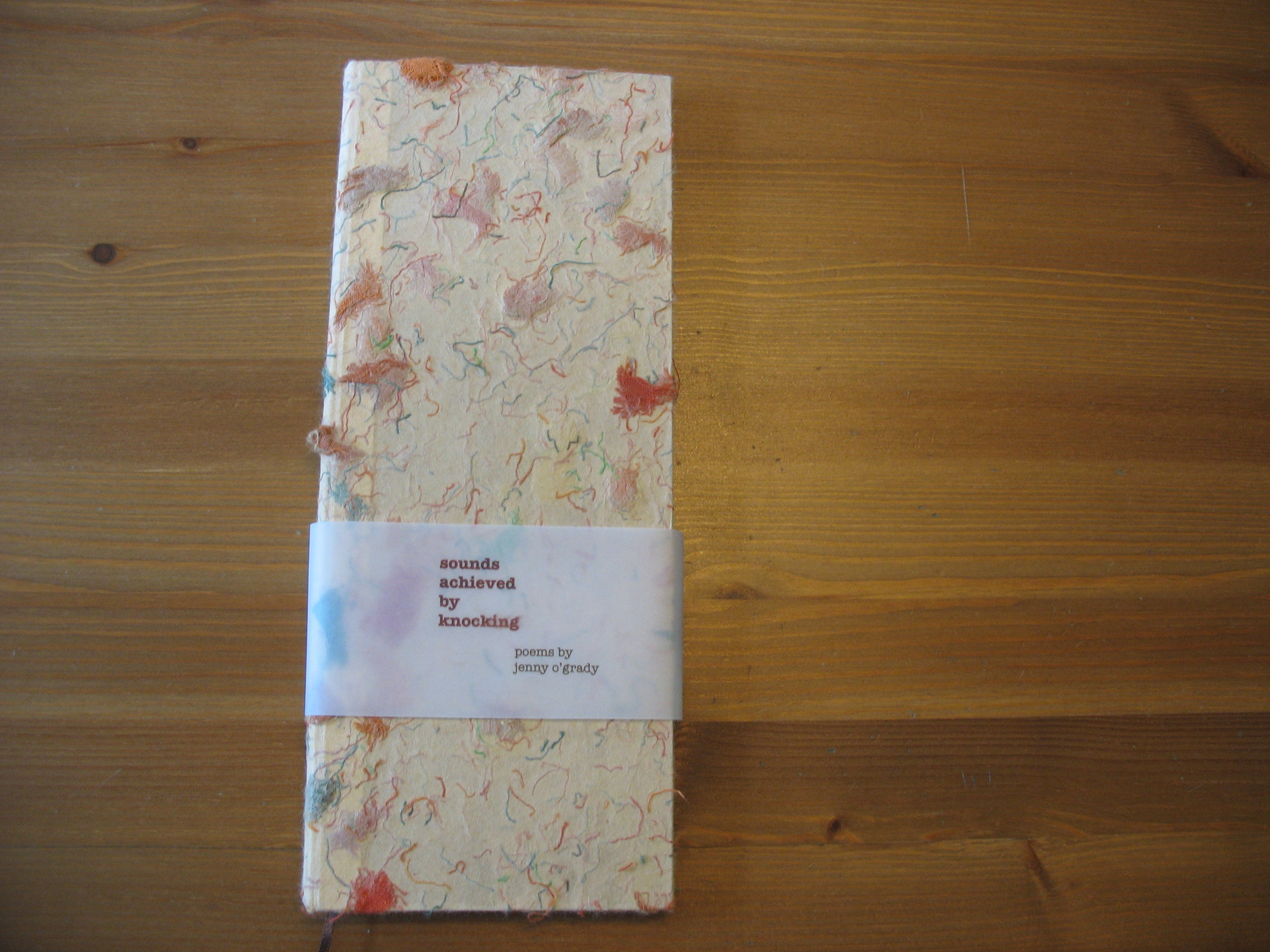 Sounds Achieved by Knocking is a traditional codex book measuring 5.5 by 11 inches. It was made with binder board, fine resume paper, ribbon and vellum and was printed with an ink jet printer using Quark. The cover stock is a fibered paper designed by papermaker Cal Ling entitled “Autumn.” The book contains my thesis collection of poetry.