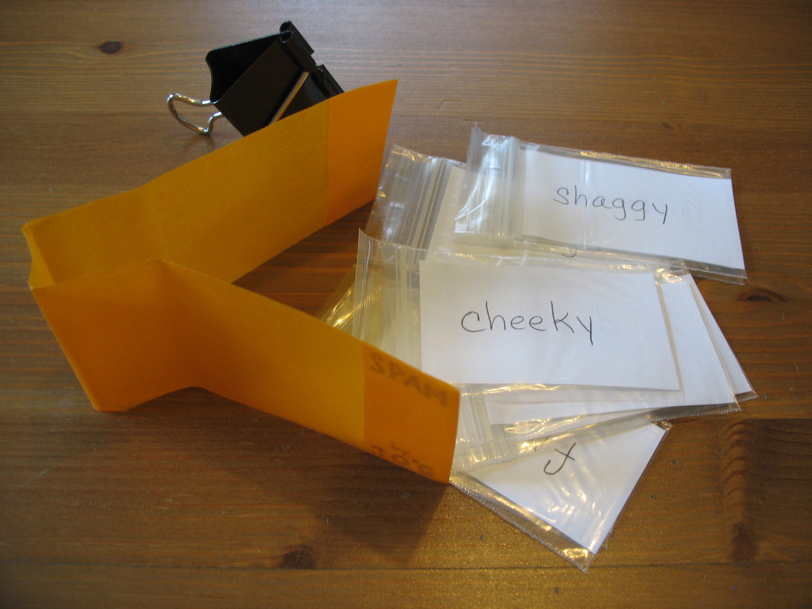 The SPAM Book was made with orange vellum, a black binder clip and about twenty tiny plastic baggies each containing a word taken from a series of SPAM e-mails received during the summer of 2003. The book may be taken apart and reassembled as often as desired in order to read the words in different ways.