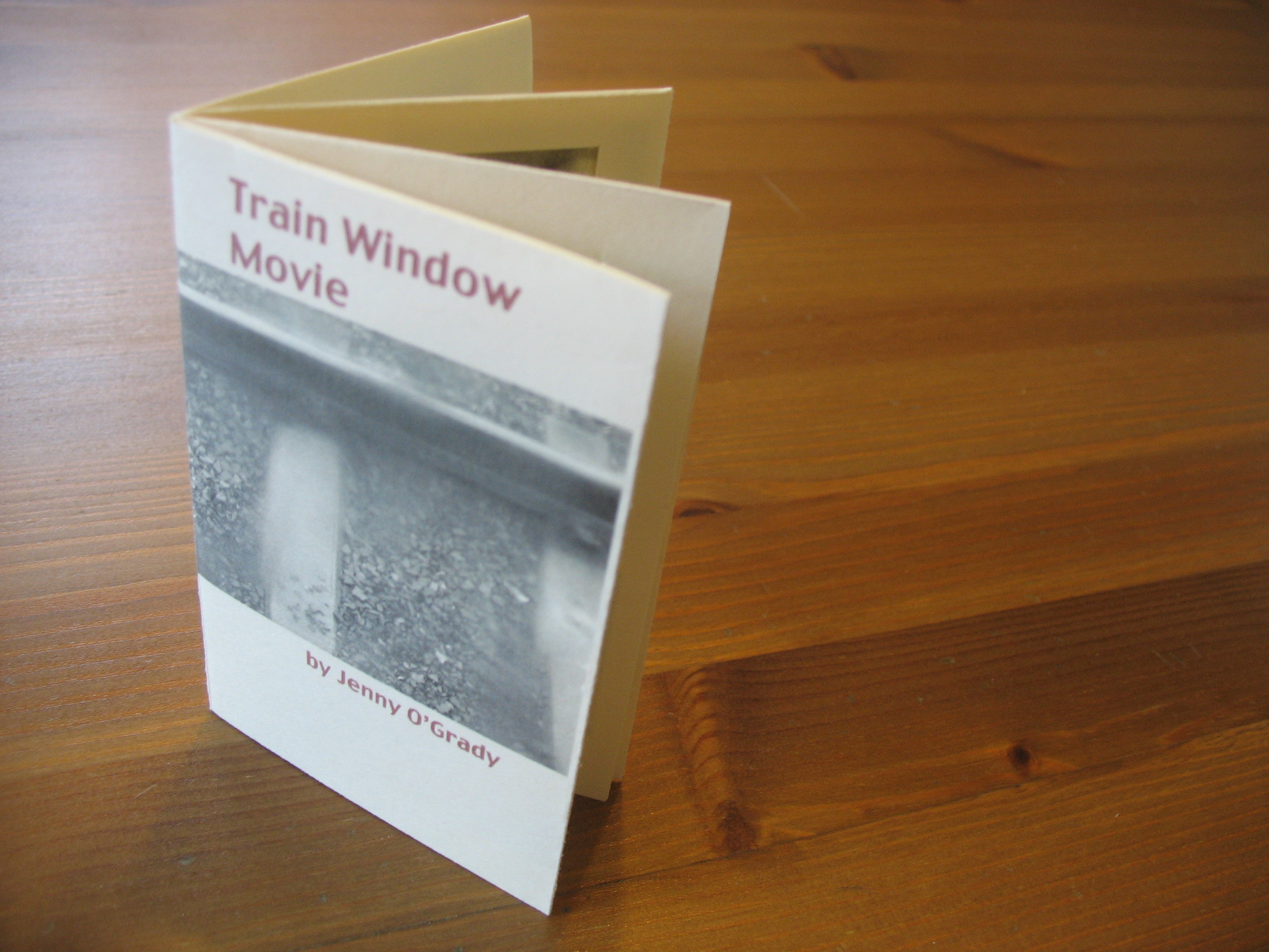 Train Window Movie is a six-page book made by folding one sheet of card stock, a form I like to call a “magic book.” The poem and photos were printed on an ink jet printer using Quark. The windows were cut out by hand. >> Purchase on Etsy here.