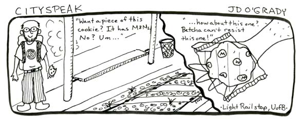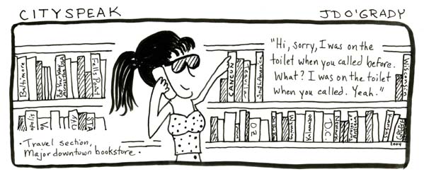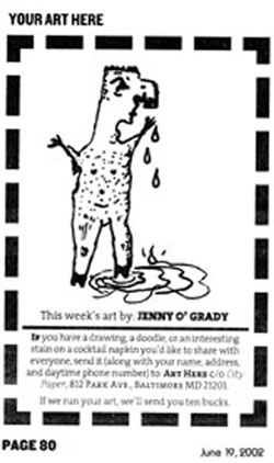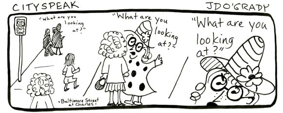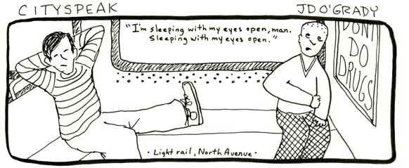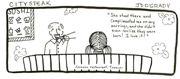 I love comics — graphic novels, comic strips, everything. Below are a few examples of a strip I created entitled “Cityspeak,” which incorporates actual conversation collected around Baltimore, along with a couple of other random pieces. (The first strip, “Sushi Earring” was included in the City Paper comics special 2004 as an honorable mention.) I also wrote and illustrated a 24-page comic chapbook called “The Laundry Girl.” Drawing is fun.